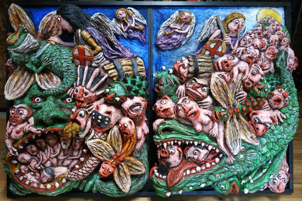 nuance-t-il. « Ce sont les comportements rencontrés dans la vie de tous les jours, du petit monde du travail au petit monde du voisinage en passant par les faits de société, les travers humains. Cela avec un humour parfois féroce, une observation parfois cruelle, souvent critique, le tout étant à considérer comme un exutoire.» Les lâchetés de tous acabits, les noirceurs de l’âme humaine, les petits héros et les grands méchants : rien ni personne n‘est épargné par le miroir que propose l’artiste. Présentée en avant-première au Dahu à cinq pattes, sa réinterprétation de « La chute des anges rebelles » taille d’ailleurs avec jubilation un costard diabolique à Poutine.